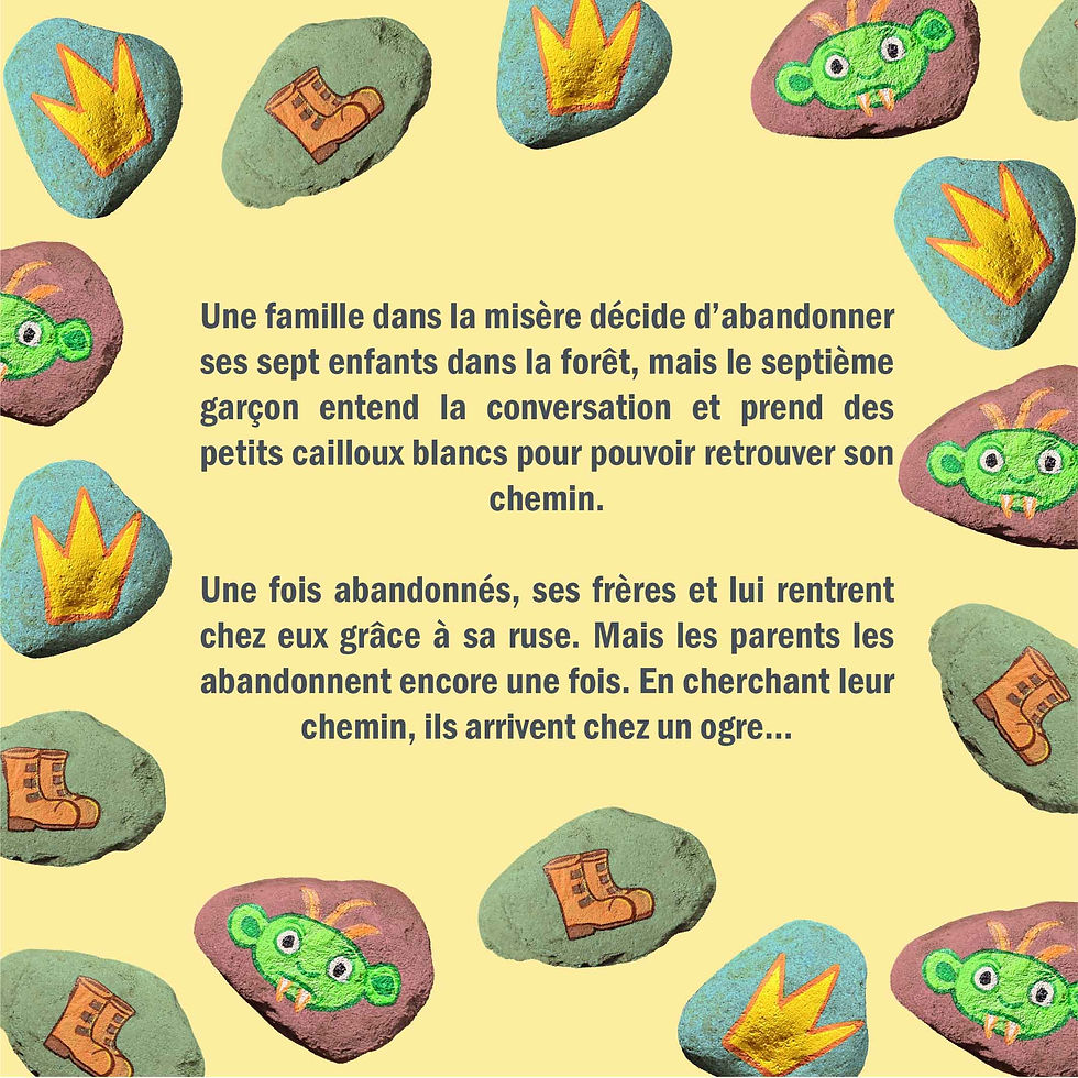 Ces galets stylisés servent de repères visuels : chacun contient une illustration-clef du récit (bottes de sept lieues, ogre, couronnes).
